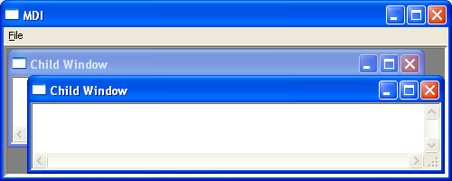 The following short program demonstrates how to create a Multiple document interface. Clicking the Menubar item file followed by the menu item new creates a new MDI child window containing a textbox.